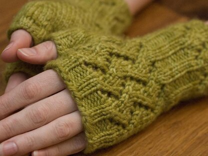 Wild Growth is a study in gauge. In the larger gauge, the gauntlets look more rustic, whereas the smaller gauge produces a more delicate effect. In either case, the pattern resembles leaves and vines wandering over the back of the hand, much like a wild growth meanders over a hillside.