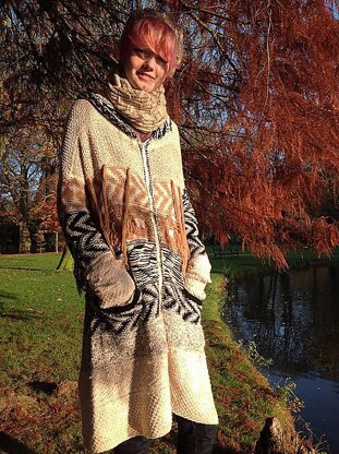 This is a wild concoction of beloved classics, joining Guernsey fisherman’s stitches with Dineh motifs. Combine it with fairisle experiments in garter fairisle, inside out fairisle and fringes everywhere, you have a very modern take on the comfy winter cardigan. The zipper is an easy closure, the hood keeps you warm on a chilly morning or afternoon’s walk. It’s knit bottom-up, with the narrow sleeves knitted in top-down, the hood picked up from the neckline BO. The sample is a long cardigan for a tall woman, but the separate motifs make it very easy to customize the cardigan to any length.