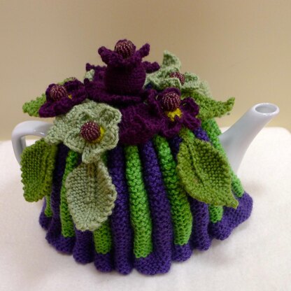 This ornately decorated tea cosy looks like a work of art but is quite easy to achieve. Knit the tea cosy base pieces first and then make your leaves and flowers. The entire cosy is knitted in 8 ply (DK) so knits up quite quickly. Take your time when placing the leaves and flowers to ensure that you have placed them exactly where you want them. A few pins can be helpful during this process. Choose your favourite colours or go with with this lush purple and green theme.