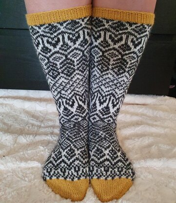 Wilhelminas are long colorwork socks for women. They are knitted from leg to toe with reinforced heel. You will need three contrasting colors, colorwork is knitted with two colors. You can use either DPNs or circular needle in knitting the pattern.