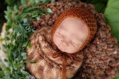 SIZE: photographer's 'newborn', 5 to 8 lbs SKILL LEVEL: Beginner, this bonnet is knit flat, then seamed YARN WEIGHT: #2 Sport NEEDLE SIZE: 3.5mm (US4) TECHNIQUES USED: Knit, purl, yarn over, knitting two stitches together. TIE OPTIONS: Crocheted ties, I-cord ties, or knitted ties LANGUAGE: English TERMINOLOGY: Standard US