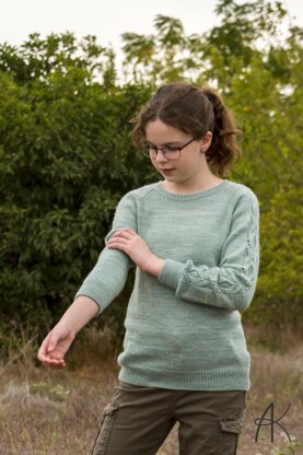 The pullover is knit top down in round. The neckline is formed using short rows. Then the yoke is worked as a one piece, until the sleeves are separated from the body, and knit in round. The sleeves are worked in round too, no seaming is required. Bust darts are optional.