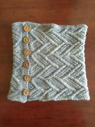The cowl is worked flat in one piece beginning with an I-cord Cast-On and fastened with buttons. The cable pattern is both written and charted.