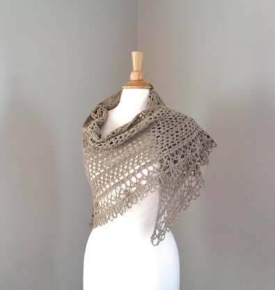 This airy shawl has an open mesh texture and bold lacy border that looks like hanging flower buds. The fingering weight yarns gives a crisp stitch definition, great drape, and a comfortable light fabric.