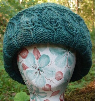 This hat was inspired by a breezy day, and images of leaves, blowing in the wind. By a bit of clever increasing and decreasing, the leaves on the cuff lean slightly. As an added bit of whimsy, and additional leaf dangles from an I-cord tail.