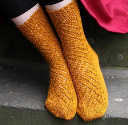 The medieval heart of Edinburgh is built on a hill, and is crowned by a fairytale castle. Stone staircases, enclosed in narrow wynds and closes create mysterious passages which ascend the hill. The geometric lace pattern which adorns these socks is inspired by these staircases.