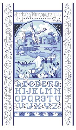 By Linda Gillum. A classic delft blue scene is reminiscent of Holland and their many windmills and waterways. A lower case alphabet tops this charming design with a larger upper case alphabet below. The Windmill Sampler would look wonderful in a kitchen or breakfast nook.