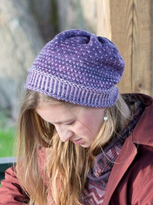 Construction Notes Winnimere is a warm and loose fitted hat showing off stranded stitch patterns. It features a Latvian braid and corrugated ribbing brim followed by a simple, flecked colorwork pattern which fades to dark before the decreases form the gathered, slouchy crown. Shown in Large with 1” positive ease