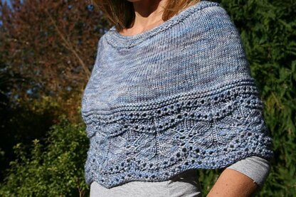This capelet is knitted in the round from the bottom up. It requires any aran weight yarn to do. Bigger size may be obtained by adding repeats of lace pattern or using thicker yarn and bigger size knitting needles (check gauge!). It requires basic lace knitting skills.
