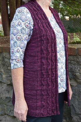Cozy cables wrap around neck and shoulders and cascade down the front of this versatile vest. Knit in worsted weight, with an intuitive and relaxing cable pattern, slight A- line shaping for a casual fit, and minimal finishing, it will be a lovely addition to your fall and winter wardrobe.