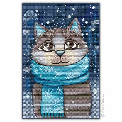 Winter Dreams Counted Cross Stitch. Easy to Follow Embroidery Chart featuring a cute and festive looking kitten in a blue scarf. Great handmade gift idea for any cat Mum or Dad or winter craft project for a keen stitcher friend.\n\nSize: 95w x 143h stitches\nStitched on Aida 18ct: approx 17 x 26 cm (7 x 10 in)\nDMC Threads: 26 solid colours (5 blends)\nUsed stitches: full cross stitch, half cross-stitch, backstitch\nSkill level: Beginner / Intermediate\nStitch time: 65-95h\n\nCross stitch pattern in PDF, Instant Digital Download includes: 1) cover page with preview; 2) instructions, symbols key and shopping list (DMC thread colour numbers and estimates, as well as fabric options); 3) two black and white charts, with and without backstitch; 4) two colour charts, with and without backstitch; 5) single page PDF for Pattern Keeper (available on request).\n\nPlease note: This pattern is for personal use only - not for commercial use. You can't make copies of our charts to distribute (either as PDF or printed versions) but you can definitely sell your finished cross stitch work.