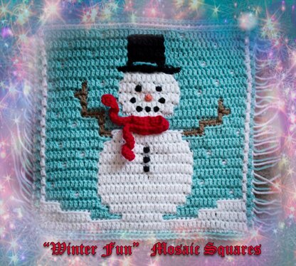 To complete this pattern as in the image, you will need 4 colors of yarn to stitch the square - one for the background (I used turquoise) and 3 colors for the snowman (I used white, brown & black). You can also stitch this pattern with only 2 colors if you wish - one for the background and one for all of the snowman, including the arms & hat.