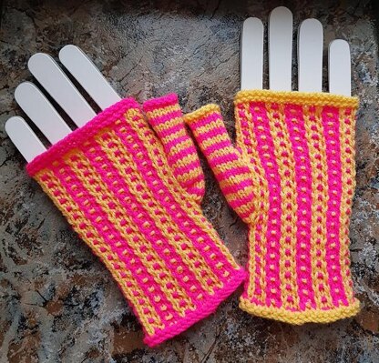 These colorful mitts are easy to make using only one color per round. The slip stitch pattern creates a double layer of warmth to keep you toasty warm during the Winter months. Specific yarn amounts are given so you can use miscellaneous stash yarns or your handspun yarn to knit yourself some Winter warmth.