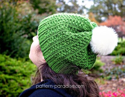 This hat has become my absolute favorite! It has a knit look, fits well and is very warm. I added a fur pompom but of course, that is optional. It's worked flat from band to crown and then seamed so construction is super easy.