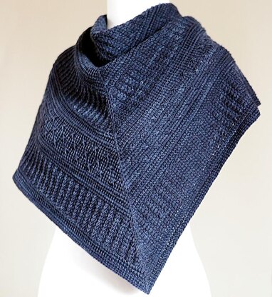 Winter Nocturne is a textured triangular shawl worked from the top down in alternating sections. The pattern contains both written instructions and charts.
