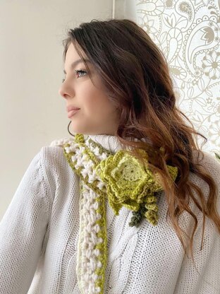 This is an attractive lariat that works up fast and the final result is extremely appealing. The tutorial will guide you in making the lariat, along with the rose(s), vines and sprigs. Yarn and hook: 50 gr of bulky yarn of your choice for the lariat with a 9mm hook (US M/N-13 / UK 2/0) and DK yarn for the edging (about 30 gr) with a 4 mm hook. (US F/ UK 8). Other: Tapestry needle for weaving ends, sewing needle and thread, brooch pin (optional). Stitches in American terminology: chain (ch), chain space (ch-sp), stitch (st.), slip stitch (sl st), skip (sk), single crochet (sc), half-double crochet (hdc), double crochet (dc), treble (tr).