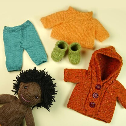 Puppenmuttis werden strahlen: Mit dem schönen Kapuzenmantel, kuscheligen Schuhen, einem superweichen Mohairpullover und langen Hosen ist ihre Puppe für den Winter bestens ausgestattet. Die Kleidung passt meinen Puppen Mathilda, Anni und Olivia. Im Set enthalten: eingeknüpfte Haare, Mohair-Pullover, Hose, Kapuzenjacke, Filzstiefel und Schuhe mit Zöpfen – nicht die Körperanleitung! Die unten aufgeführten Garne sind nur Vorschläge.Zum Teil in Runden gestrickt!