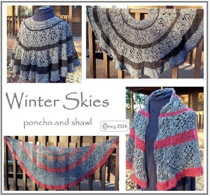 • the poncho and shawl, made along similar lines, are a fun knit: you start at the top, increasing on certain rounds/rows with the sparkly mohair and then work rounds/rows of lace patterning to make a fun, worsted weight poncho or shawl • poncho is worked completely in the round – only finishing is tucking in the ends. • shawl is worked flat, starting with a small tab and then carrying a patterned border while repeating the pattern rows 5x across. • the mohair blend used has sequins so you get a bit of sparkle – the stars at night – while gradually increasing the number of rounds/rows using the mohair