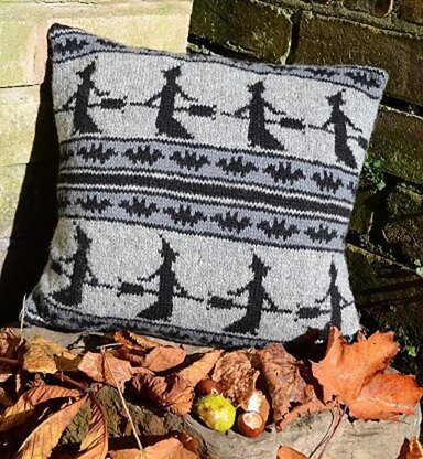 The pattern is knit on 3.75mm needles in Jamieson's of Shetland 100% Shetland DK yarn and will require 3 x 25g balls in Dove, 2 x 25g balls in Steel and 2 x 25g balls in Black. Also required is a 16 or 18 inch cushion pad (depending on your knitting tension). Exact tension is not critical.