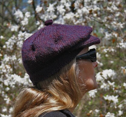 This peaked cap is styled on the traditional men's driving cap or Field cap, but for women's sizing. The yarn used can make a difference in the sizing: using an aran yarn may give you a larger man-sized cap whereas the Patons Classic Wool Worsted recommended should result in a cap that will fit anyone with a 22" size measured on an angle from the back neck, over the ears, and mid-way up the forehead. The band should be a bit too snug at first, but will relax with wearing and do a good job of blocking the wind. Other worsted weight yarns can be used provided they are soft enough to wear against the forehead.