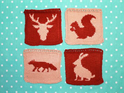 This is a set of intarsia charts for a collection of woodland animal silhouettes, including a fox, a stag head, a hare and a squirrel. These are mini versions of my full size cushion patterns, so you could have a set of bunting to match the cushions!