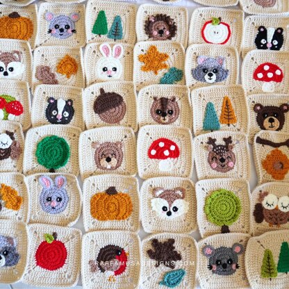 The crochet Woodland Granny Squares are 22 woodland/forest/Fall/autumn-themed Afghan blocks and appliques. Use your squares to make woodland-themed baby blankets and throws, pillows, cardigans, bags, or anything that is made with granny squares.