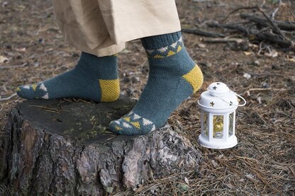 The Woodland socks are worked in the round, from the cuff to the toe. The pattern includes a written description of the pattern and charts. You can use your favorite method for small circumference knitting: DPNs, magic loop, small circumference circular needles. The pattern describes the knitting on DPNs.