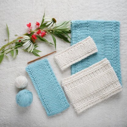 Crochet this cozy ear warmer and cowl set for everyone in your family. The ear warmer pattern is written in four sizes: toddler, child, adult small/medium and adult large/x-large. The cowl is sized for toddler/child small and adult. These warmers are made with worsted or aran weight yarn - organic cotton and wool shown in pictures.