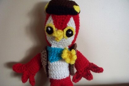 He stands almost 11 inches tall for hugs and is made with soft acrylic yarn, all yarn eyes and super plush polyester filling. His hat and vest are removable.