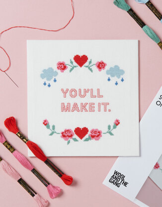 Wool and the Gang's take on cross stitch. Our all-in-one kits have everything you need to get your stitch on - from the itty bitty needle to the double mercerised stranded cotton. This cross stitch kit features the inspirational words ‘You'll Make It' surrounded by flower, heart and cloud motifs.