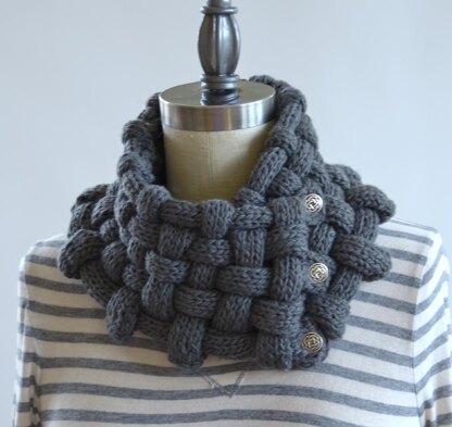 This necker is worked in two pieces that are woven together to form the perfect topper for warmth or style.