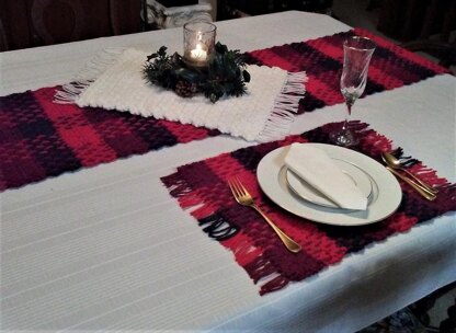 Pattern includes how to make solid color and patterned placemats and table runner using Caron One Pound yarn. Placemat is 13" x 20", runner is customized.