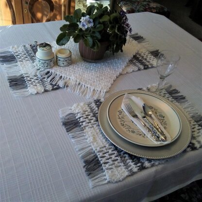Crochet pattern includes how to make solid color and patterned placemats and table runners using Caron One Pound yarn in soft shades of grey with white. The base is created using the most basic crochet stitches. Then strands of yarn are easily pulled through to create striking results. The placemats are 13" x 20", runner is customized.