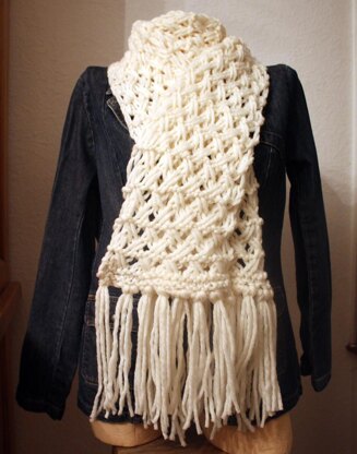 This is a super, very attractive textured scarf. The project involves cross over stitches and wrap stitches. Its very easy to do and very effective. The project grows very quickly too.