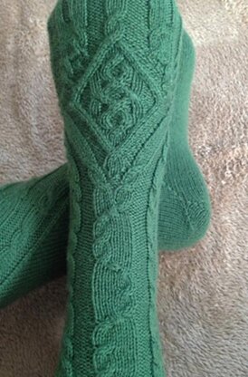 This toe-up adventure features sinuous cables which snake around the back of the leg to make room for a central cable motif. The unique Y-shaped short-row heel provides a roomier fit without wraps.