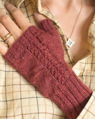 These lightweight fingerless mitts are ideal for days where it’s a bit warm for full-on mittens and you still want to use your hands. The name Wynsum is an Old English word meaning ‘joyous’ or ‘delightful’ – and sums up the feeling of knitting lots of stockinette with a simple lace motif for interest! The mitts