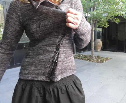 X Cardigan is a seamless shaped cardigan knit from the top down. It has simple detailing: - a small off centre collar knit with garter and st st. - a subtle asymmetric slope to the front band.- waist and hip shaping sitting in the back of the cardigan