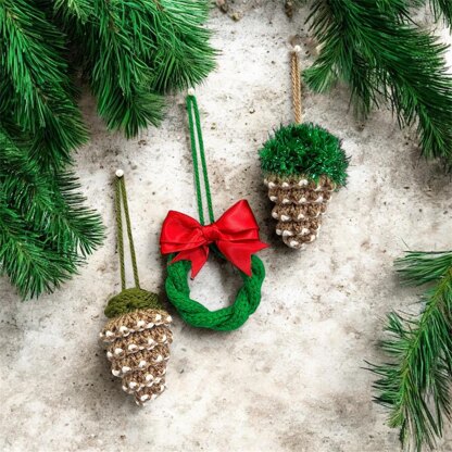 Create your own festive cheer with this delightful knitting pattern for a Christmas wreath and pine cone charms - all worked flat on two needles. Each piece captures the spirit of the season, adding homemade charm to your Christmas tree, gift wrapping, stockings, or last-minute decorations. Perfect for using up yarn scraps. Quick and easy to knit, these ornaments make a wonderful project for beginners and experienced knitters alike!
