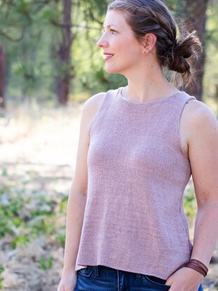 This tank top is knit from the bottom up in the round in fingering weight yarn. Decreases are used along the body to create an a-line shape, while paired with a faux seam for stability. The front and back are divided and worked separately, then joined together at the straps with a 3 needle bind off.