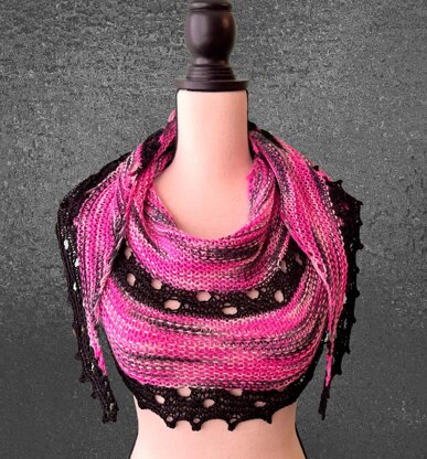 Intermediate beginner friendly and a whole lot of fun, pattern is written, construction is top-down, final size is 13” long tip-to-tip by 68”at widest point.