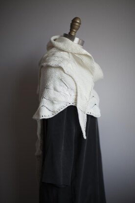 This triangle-shaped shawl is knit from the center neck down. Knit flat, this shawl is mainly comprised of garter stitch, ending with an oversized lace border.