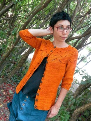 Yellow Brick Road is a seamless, comfortable crew neck cardigan mostly worked flat, from the top down. The cardigan features a lovely lace motif around the yoke, short rows to shape the back neck, waist shaping and comfortable elbow sleeves with pleats. The cardigan is intended to be worn with 0-2 inches/ 2-5 cm of positive ease at the chest. The lace pattern is available in both charted and written directions. Sample shown in size 33 inches/ 84 cm worn with 2 inches/ 5 cm of positive ease.