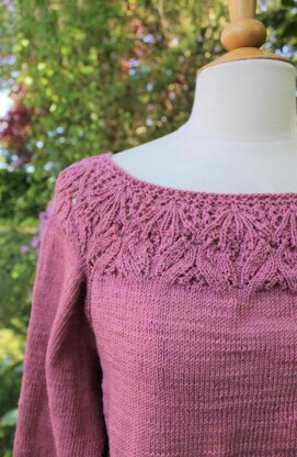 Yoga Off Mat is a loose pullover worked from the bottom edge and up with a wide neckline in lace pattern. The pullover has long sleeves with a combined raglan/round neckline construction.