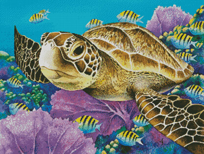 This counted cross stitch pattern of a Turtle was created from Artwork by Carolyn Steele. Original image licensed through Meiklejohn Graphics Licensing (MGL). Only full cross stitches are used in this pattern. It is a black and white symbol pattern. 58 DMC Colours are used. A smaller mini version of this pattern is also available