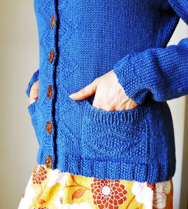 Vintage style and cozy comfort are combined in the Yvaine Cardigan. Textured diamonds adorn the simple round-neck silhouette and patch pockets. The body is worked in one piece from the bottom up with waist shaping worked along the sides. The sleeves are worked in the round from the cuff up. Yvaine is meant to be worn with about 2” positive ease in the bust; shown in size 38.25” on a 36” bust. Stitch patterns are both written and charted.
