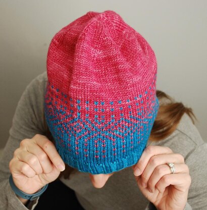 This hat is knit in the round from the brim up and incorporates a stranded colorwork pattern (charted only) to jazz up the transition from one color to the other. The amount of slouch in the hat can be easily adjusted by changing the number of plain rounds after the stranded pattern is complete and before the crown decreases are started. The pattern also includes some notes on color dominance to help make your stranded work really pop.