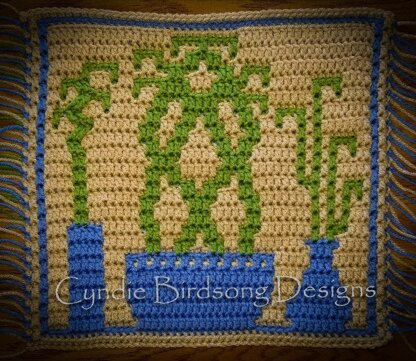 This is a great way to use up scraps! For projects using 2 colors, (one for the background & one for the featured design), you will need approximately 2 oz of the background color, and 1 oz each of the vase & bamboo colors, using a worsted or aran (wt 4) type of yarn.