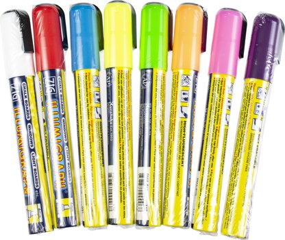 This marker features a 6mm tip, is high flourescent and is wet-erasable. Ideal for use on plastic, glass, metal, white board and a variety of other surfaces. Perfect for writing broad letters on signs, boards and more especially under UV light! This package contains 8 Illumigraph 6mm Tip Markers in assorted colors. Conforms to ASTM D4236. Imported.