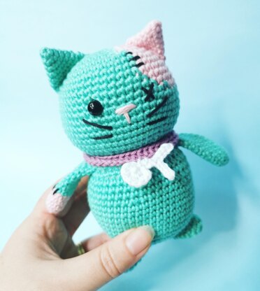 Ziggi the Zombie Kitty was designed for the Scare Me crochet along on Instagram (@amigurumi_cal). She is cute but a little bit terrifying! Make her if you dare.