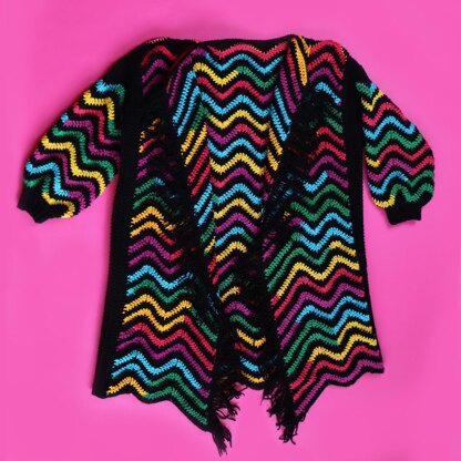The Ziggy Stardust design comes in 3 styles, Ziggy which uses a colour changing yarn to give its bold pattern and comes as a long jacket or jumper, and the 3rd style of the design which is its alter ego Stardust. Stardust mixes a glitter tinsel yarn as its colour pop to make a dramatic impact and has a zip fastening for a contemporary fit, perfect to create that jazzy party piece!